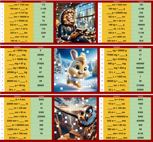 4th Grade Pixel Art Math Converting in Metric System | 6 Beautiful Pixel Art | 120 Questions