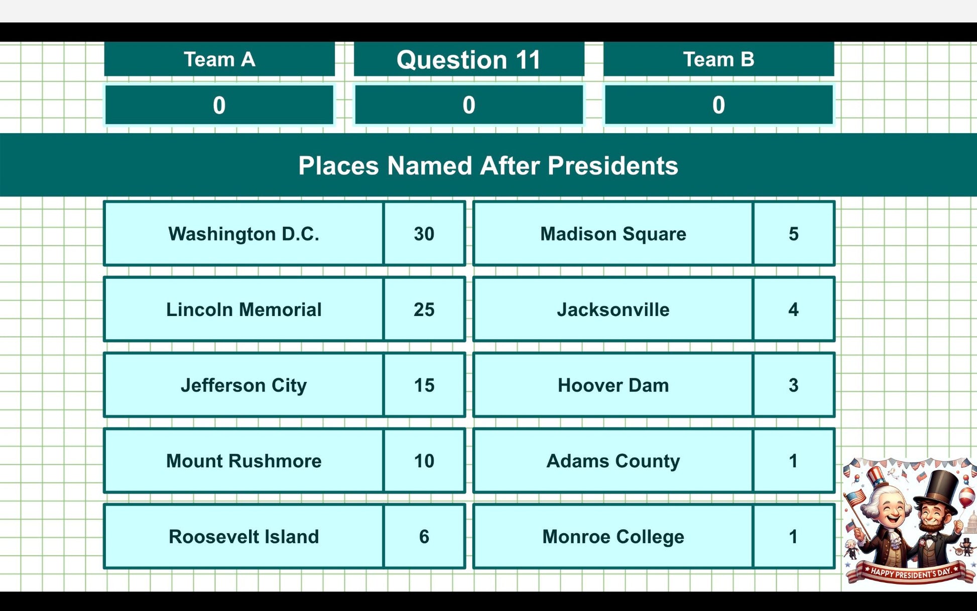 30 President's Day Family Feud Style Questions and Answers Template for Google Slides