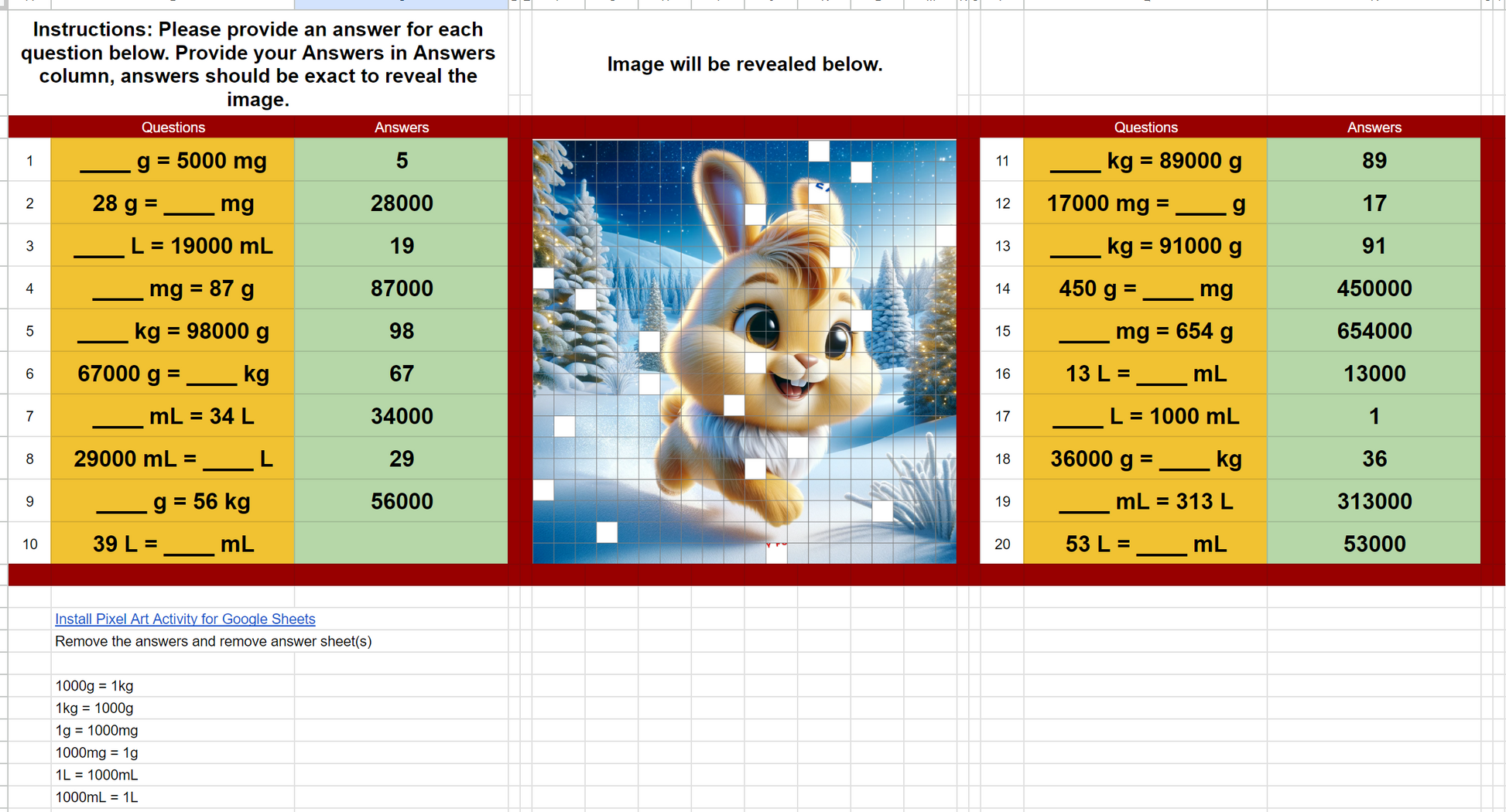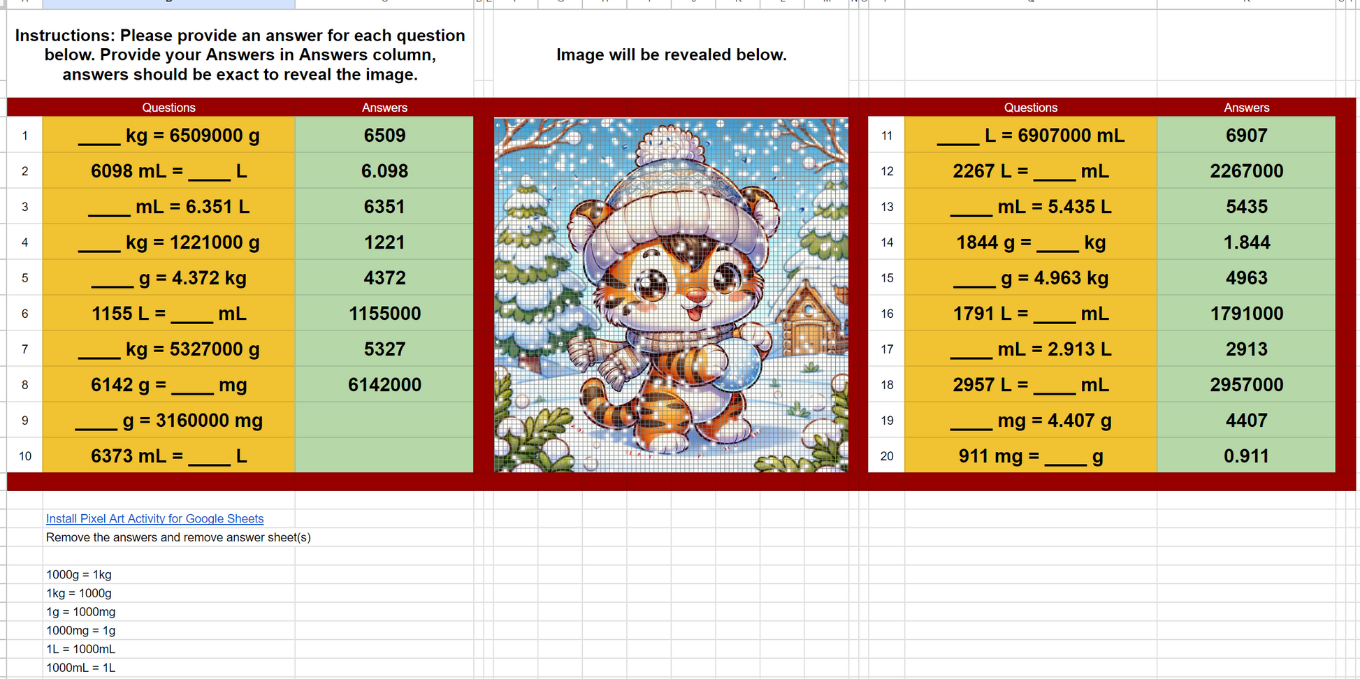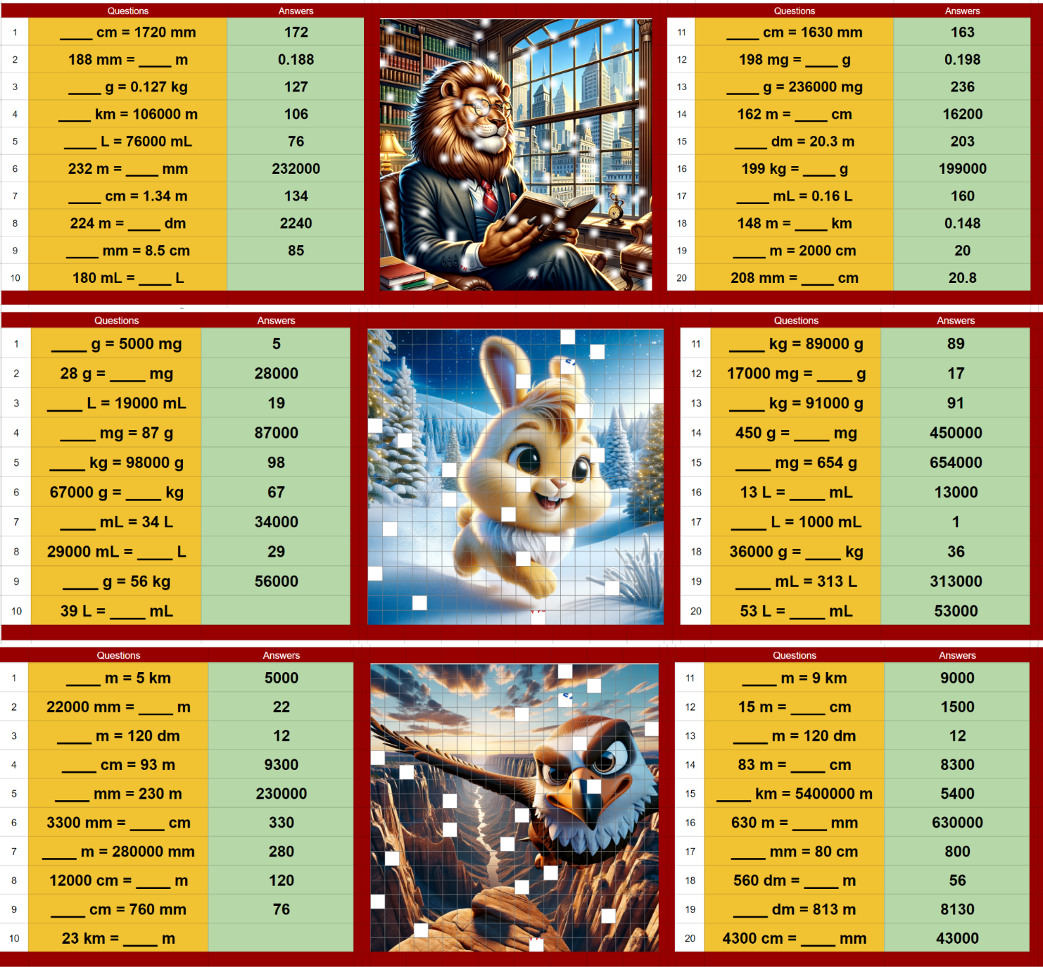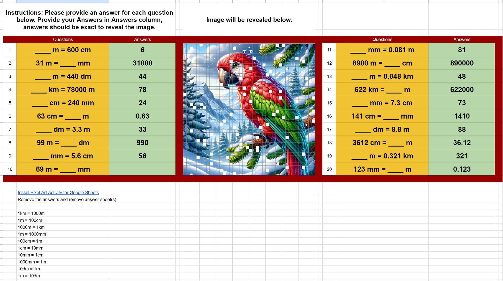 Features 120 questions 4th grade math converting in metric system in 6 Google Sheets. 6 different Pixel Art Math Reveal high quality images.