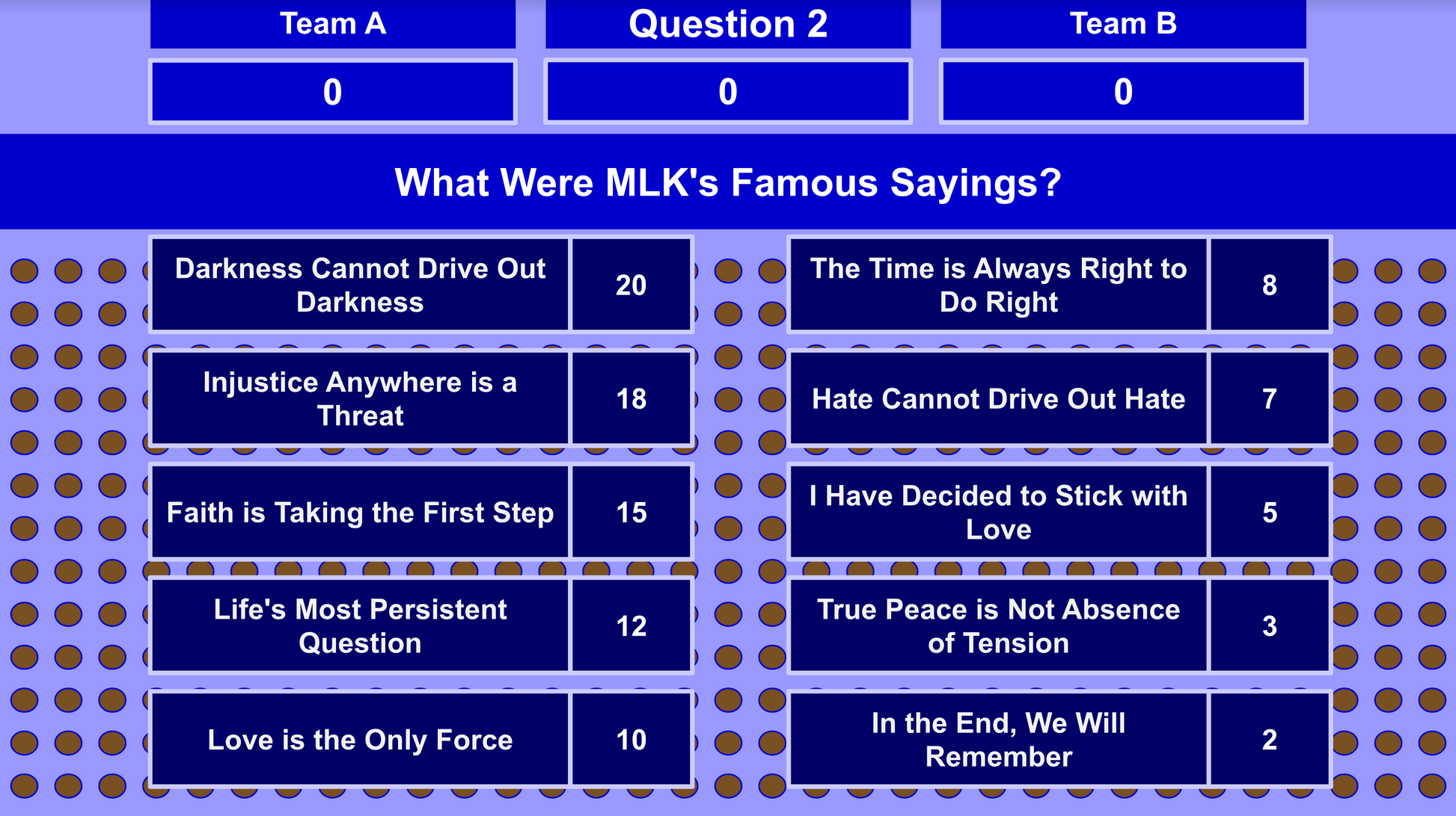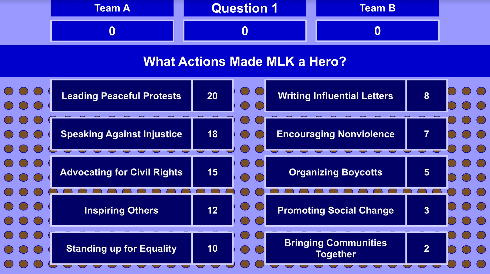 Contains 3 additional MLK Family Feud questions templates not found free on smoothslides.com. Each has 10 additional questions, you can combine or mix and match each has a spreadsheet included for you to download and copy.